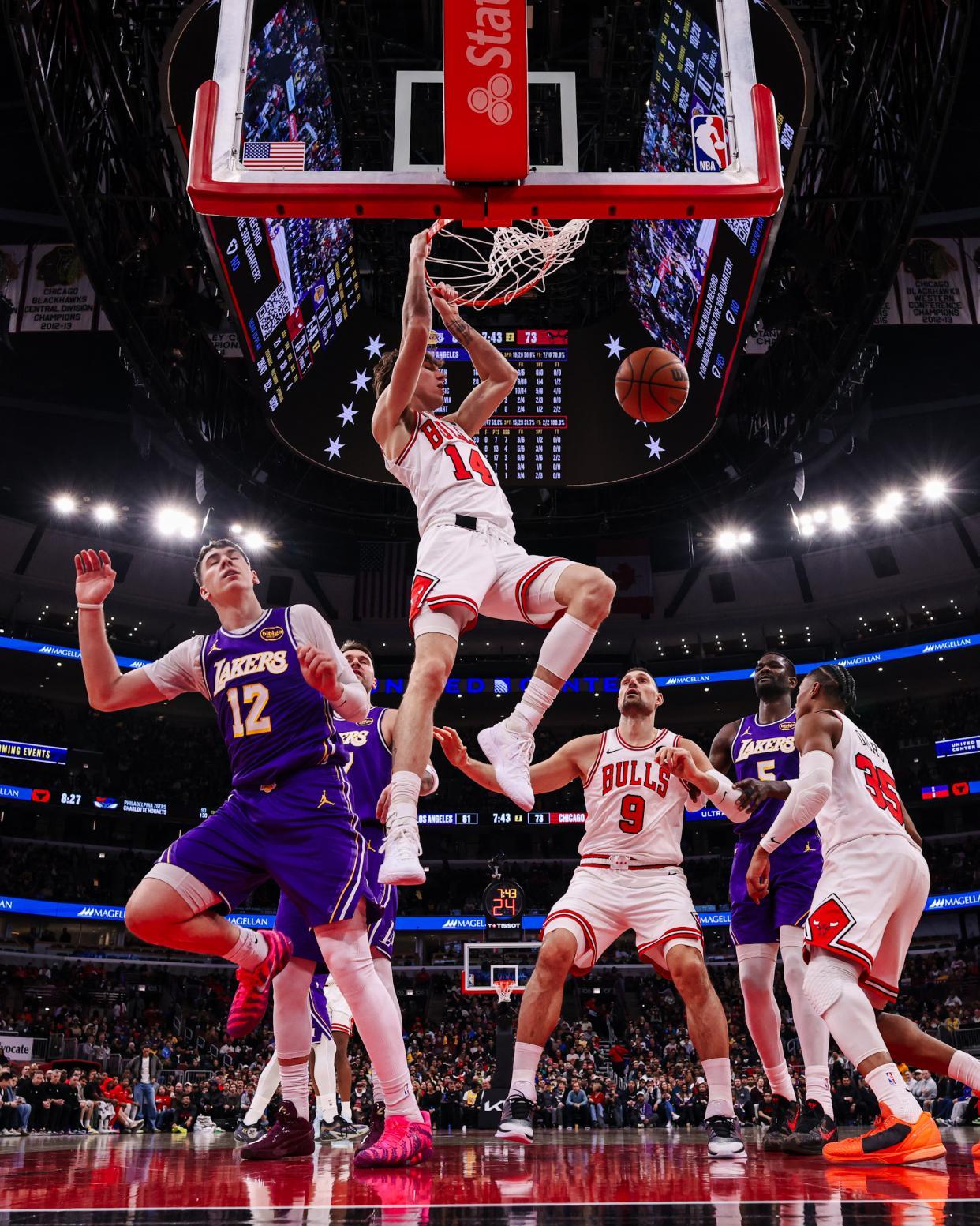 怀特抢断,布泽利斯、拉拉维亚各有外线打铁,拉拉维亚抢断,斯马特打成了2+1,湖人得以止血。东契奇2罚全中,八村塁连中2记3分球,道苏姆命中2+1,帕特里克威廉姆斯与东契奇在禁区斗法。雷迪克挑战判罚成功,海斯送出大帽,随后2罚全中。威廉姆斯抛投打进,东契奇外线不中,道苏姆上篮得分,八村塁中投取分,公牛连续远投不进。东契奇轰进三分球,还助攻范德比尔特暴扣,武切维奇技术犯规,东契奇罚球命中。第3节打完,湖人以104比89领先,东契奇单节20分3板2助攻。