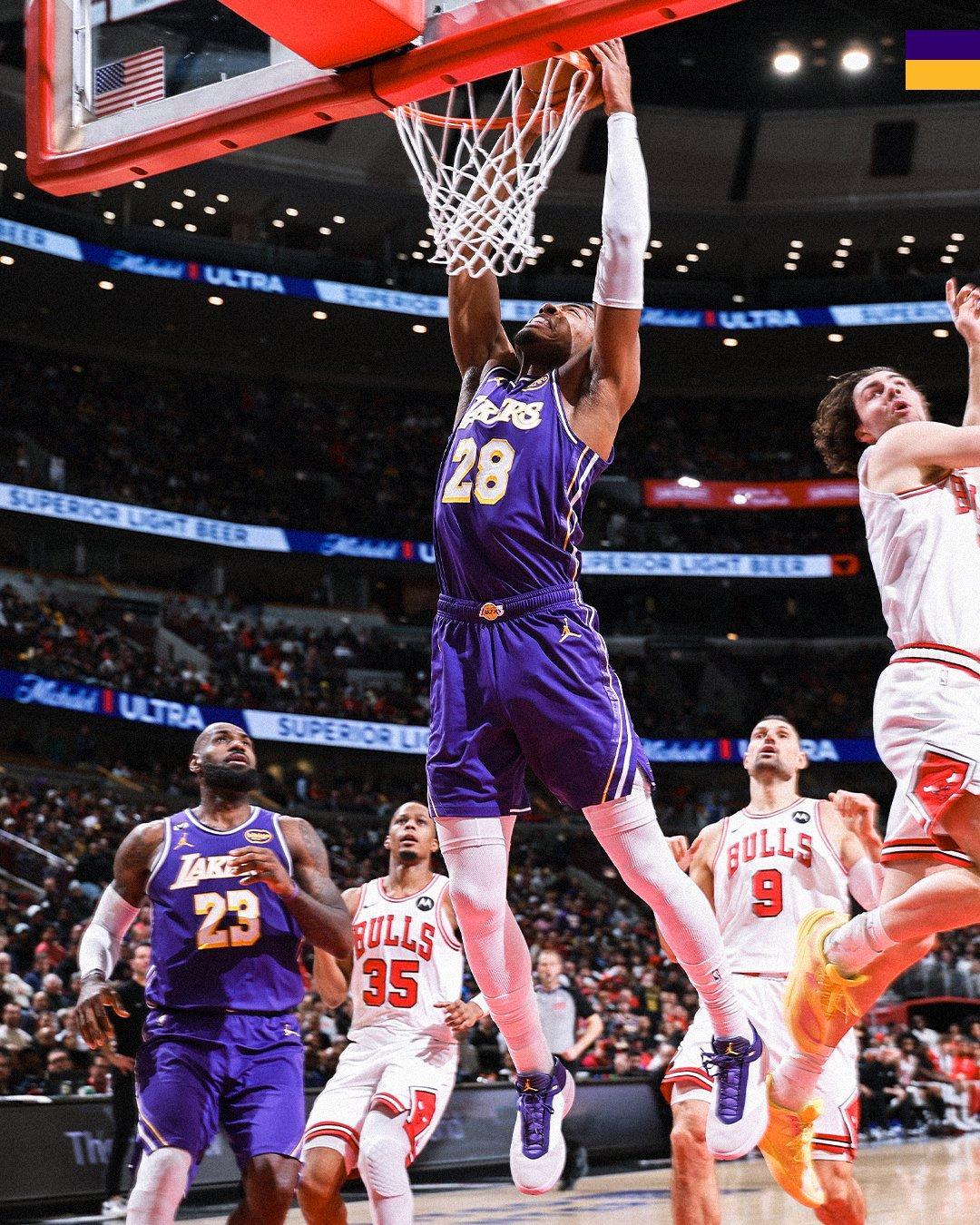 东契奇中投得分,武切维奇补篮打进,詹姆斯连续单打不进,八村塁大帽怀特。道苏姆罚进1球,斯马特2罚全中,芝加哥请求暂停。东契奇轰进三分球,湖人稳住局面,怀特外线取分,雷迪克请求暂停。詹姆斯助攻东契奇轰进远投,海斯抢断吉迪后完成胯下大风车暴扣,湖人领先14分锁定大局。