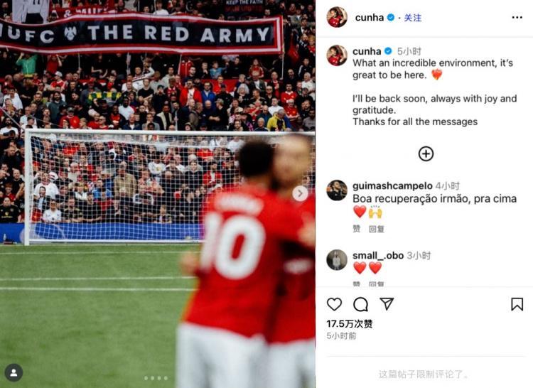 直播吧9月3日讯 在英超第3轮曼联3-2击败伯恩利的比赛中,库尼亚在比赛第31分钟因大腿拉伤提前离场,同时他还退出了本期巴西国家队。今日库尼亚在社媒晒出比赛照等多张照片,并配文写道:“这里的氛围如此之棒!很荣幸能够在此效力。我很快就会归队,在这里的每一刻我都满怀喜悦和感激。感谢你们的留言支持。”...